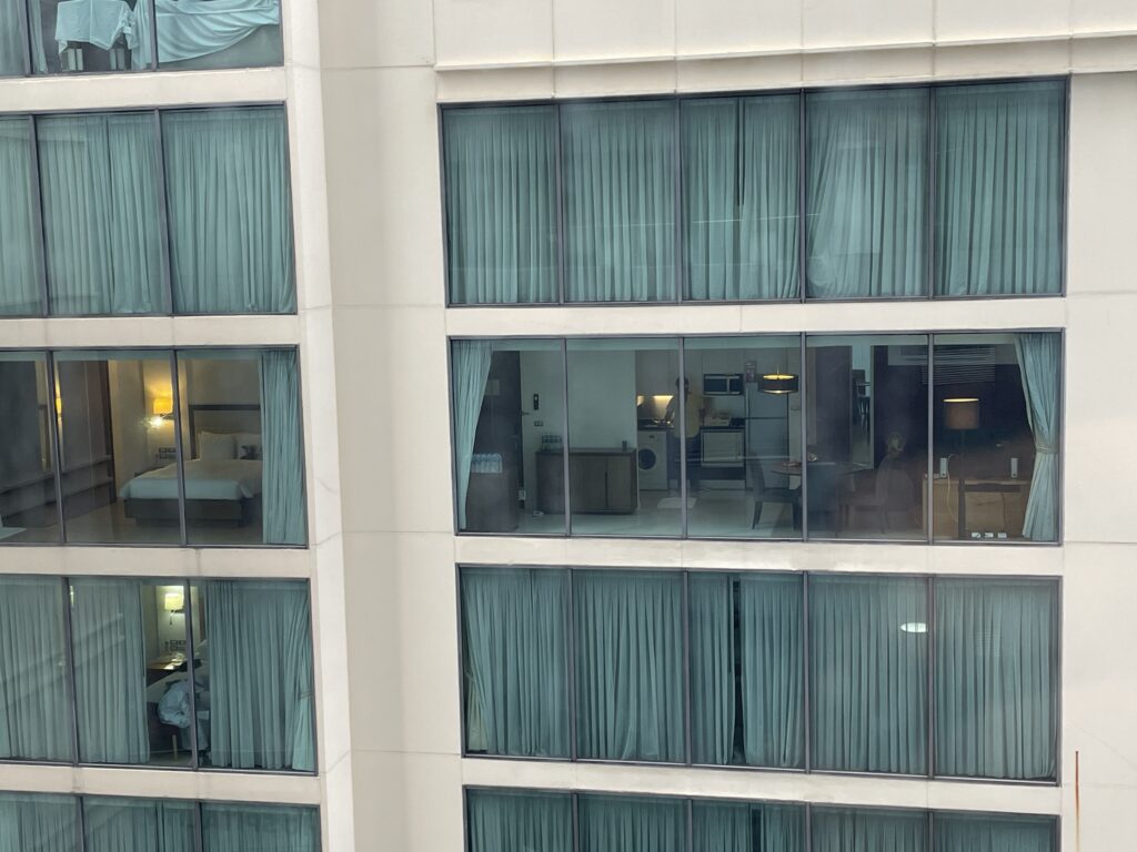 このホテルはキッチンなどが供えられたアパートメント仕様のホテルだと思いますが、カーテンを全開のせいで、生活スタイルが垣間見れました。