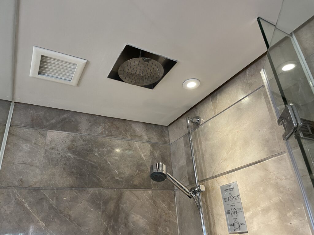 大きなバスタブのとなりにシャワー専用ブースがあります。レインシャワーは嬉しいですね。
