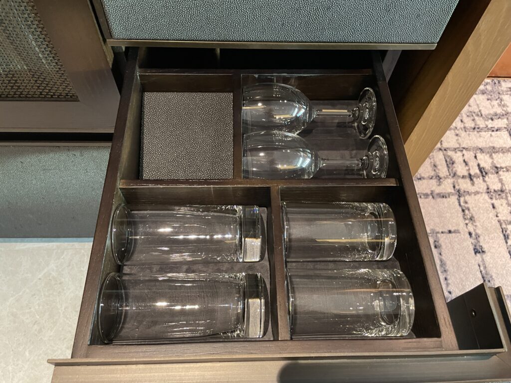 各ドリンク用のグラスセットがきれいに準備されています。お水もペットボトル直飲みではなく、グラスに移して飲んでみましょう。