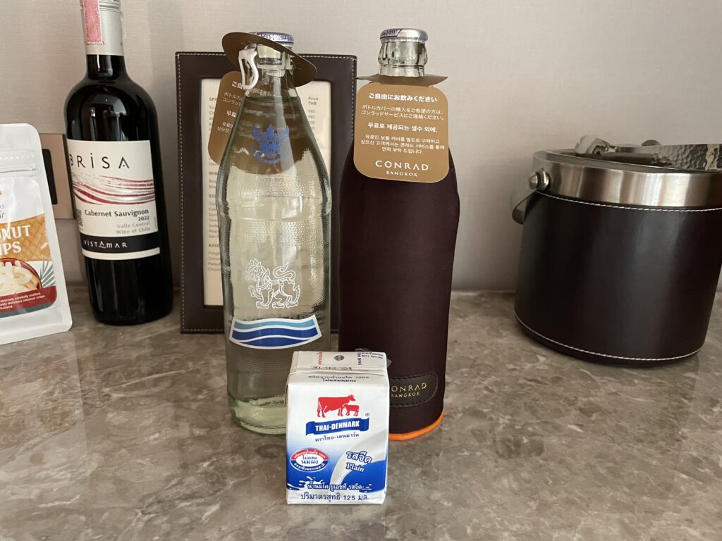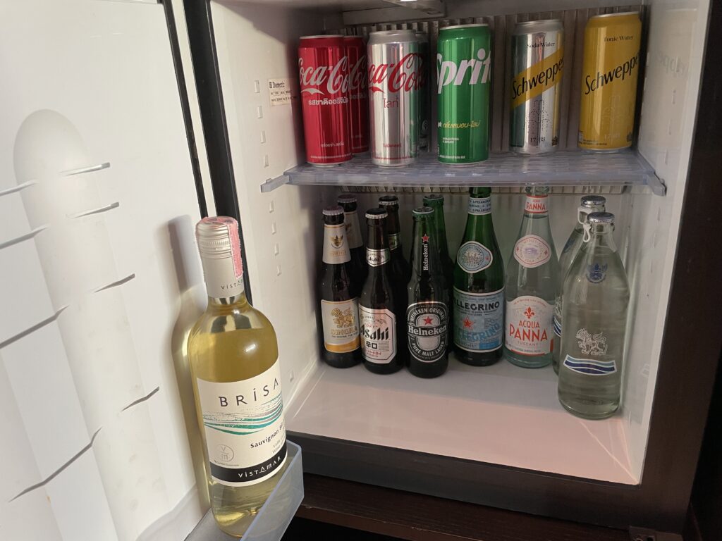 備え付けのドリンクもきっちり準備されています。右下のボトル入りのお水は無料です。それ以外はもちろん有料で市価よりは当然高めです(注:ホテルマジック!)