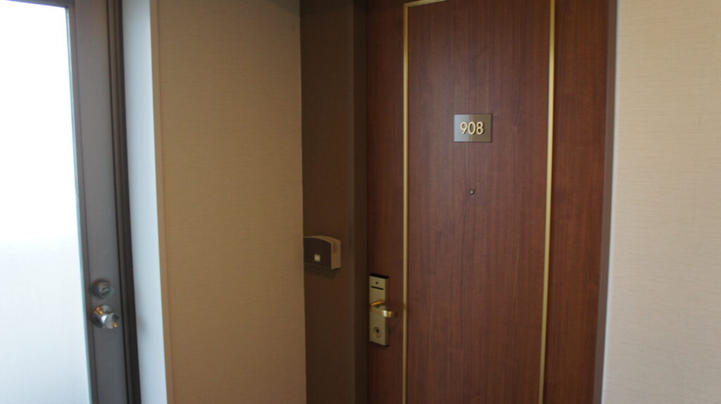 今回のお部屋は908号室です。地上11階で客室は3階~10階までになっています。最上階にはバーがあります。