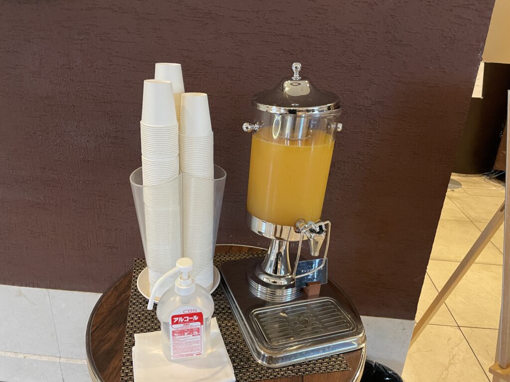 朝食が提供されるレストランの前に、オレンジジュースのサーバーが置かれていました。