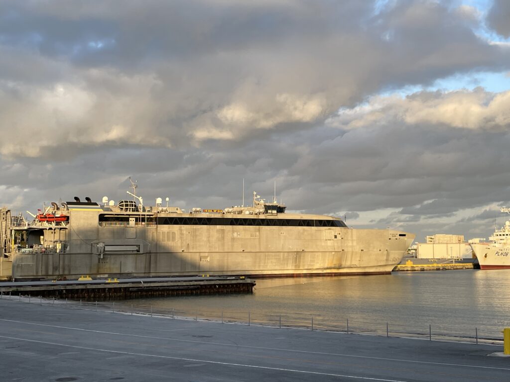 この船はUSMC、アメリカ軍海兵隊の船の様です。前の方には海上保安庁の船も見えます。