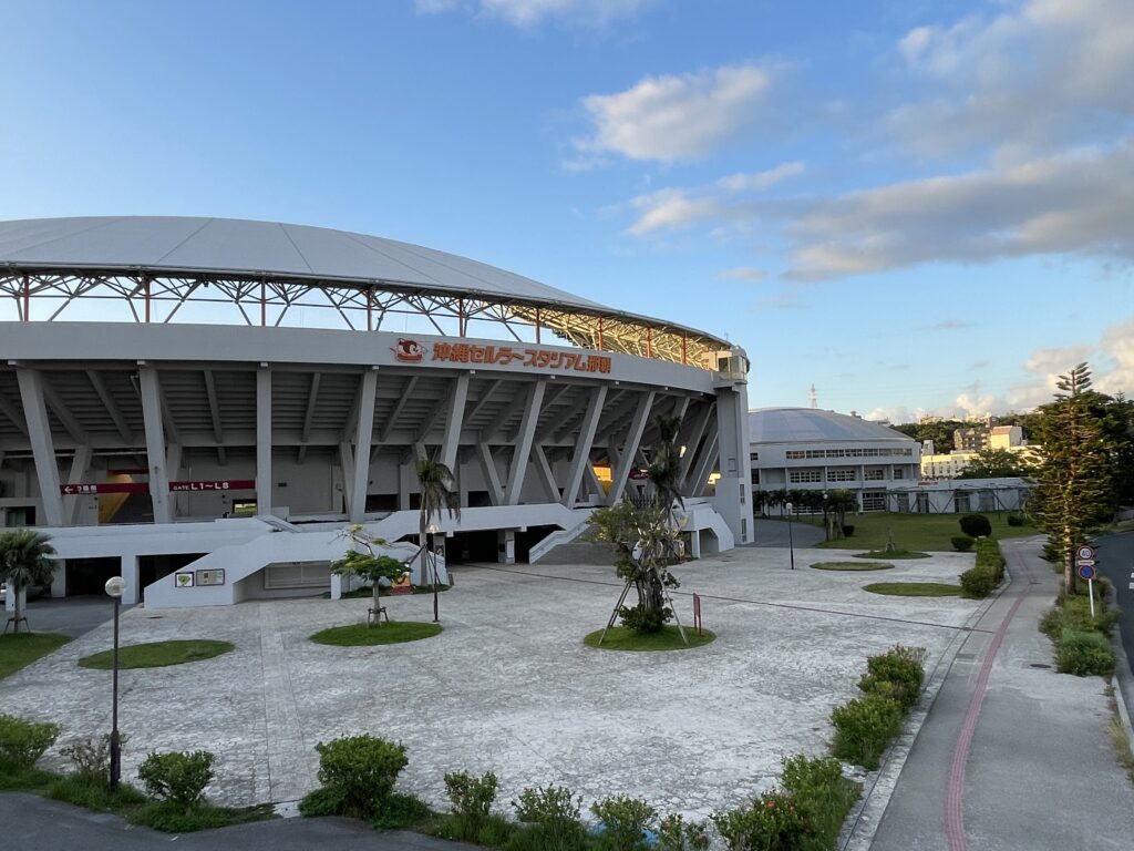県立武道館のとなりには、正式名称「沖縄セルラースタジアム那覇」があります。正式名初めて知りました。プロ野球が行われたりします。