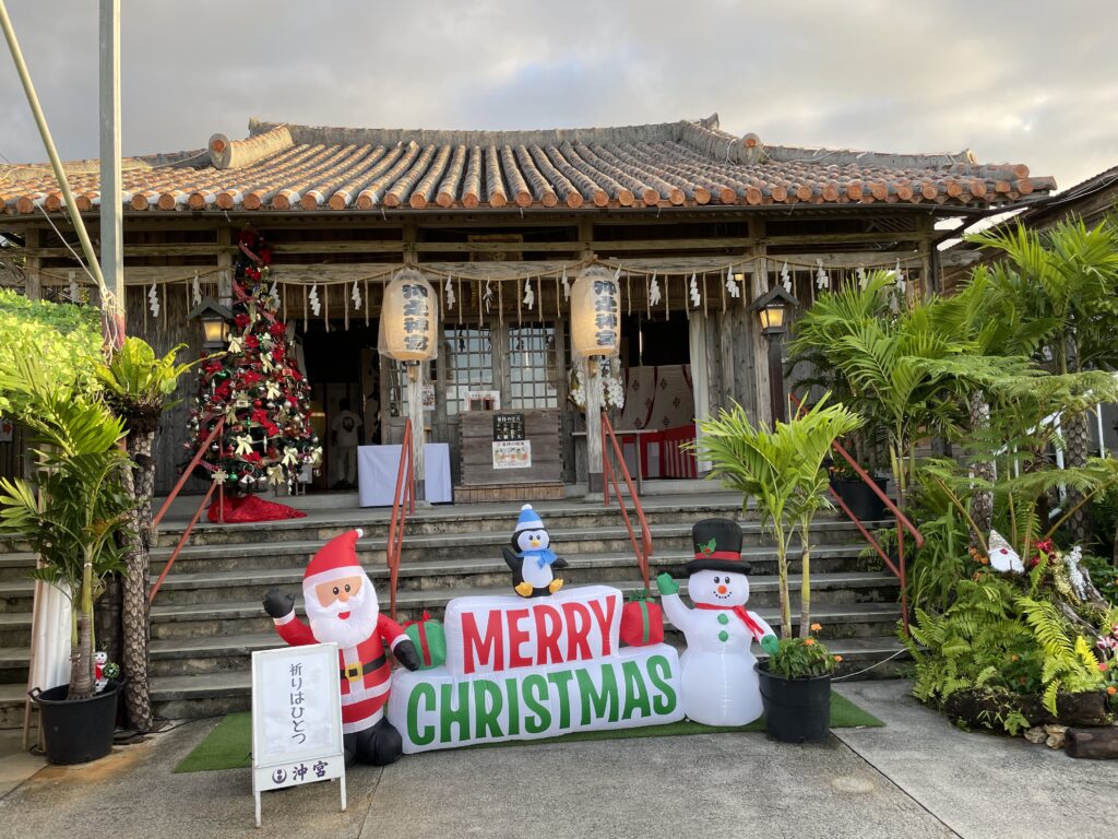 神宮にクリスマスツリーとメリークリスマスの文字とサンタとスノーマン・・・