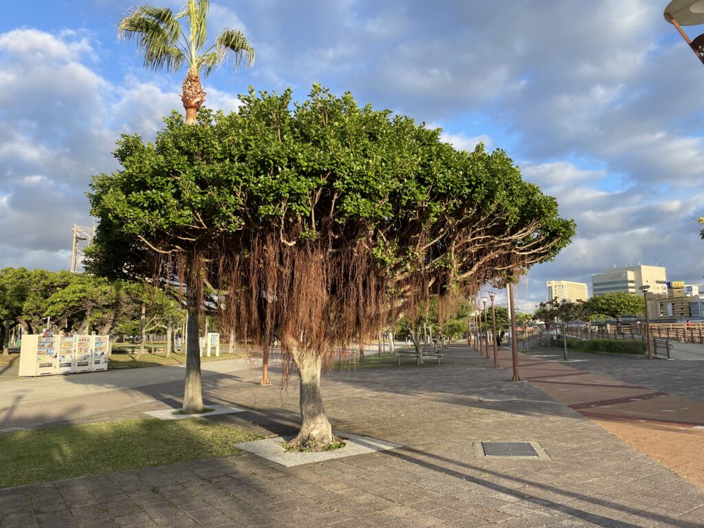 たぶんガジュマルだと思いますが、こんな木も観ることができます。枝から根のようなものが生えている木って珍しいですね。