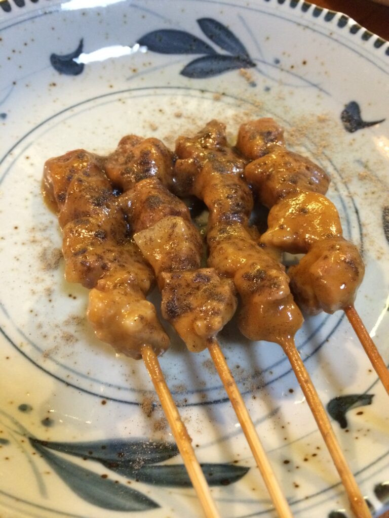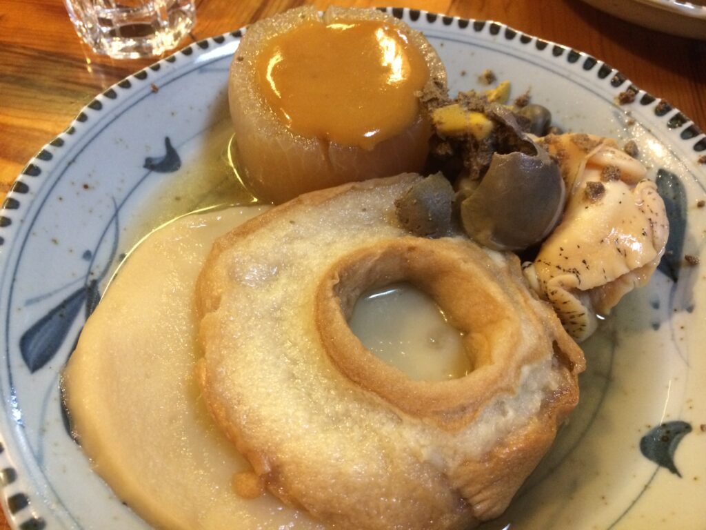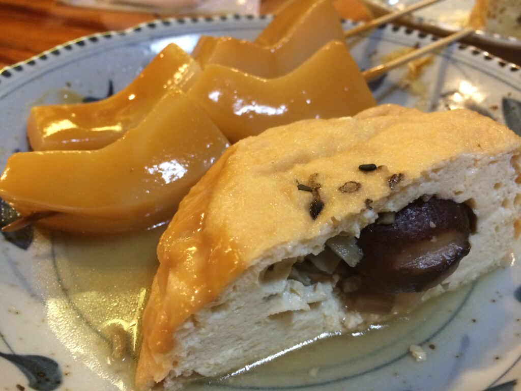 こんにゃくと巾着?「金沢ひろず」中にしいたけ、ゴボウ・銀杏など入っていました。