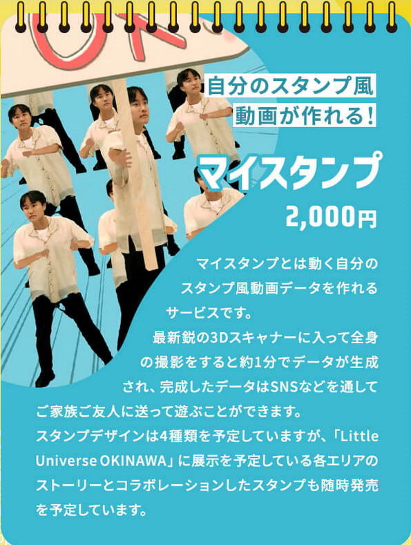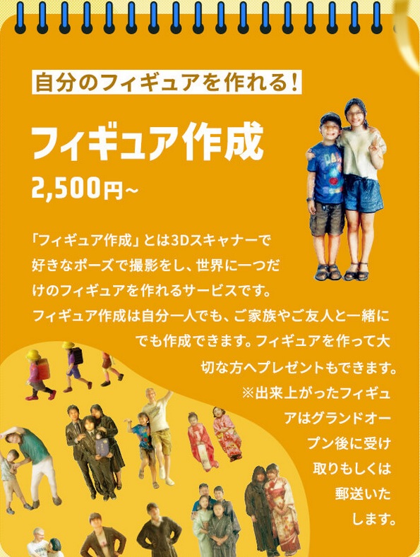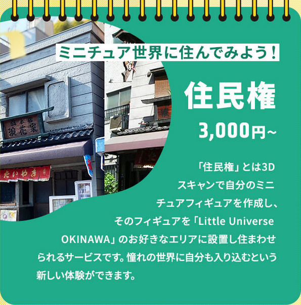 テニスコート13面分相当(総面積約3300㎡)の空間で1/80スケールのミニチュア首里城を中心に18世紀の沖縄を舞台とした『琉球王朝』エリアや、日本を代表する有名アニメや作品のエリアなどが展示されます。最新鋭の3Dスキャナーで全身をスキャンすると自身の立体データが作れ、データをもとにフィギュアを作成できます。フィギュアはミニチュアエリアに設置をしたり、スマートフォンにデータを送りAR(拡張現実)として気軽に遊べます。
