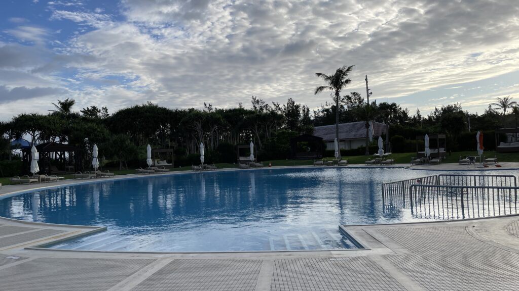 桟橋散歩からビーチに戻って、プールを見に行きました。リゾートホテルのプールって感じですね。朝ですし、営業前なので誰もいません。屋外プールと屋内プールもあります。