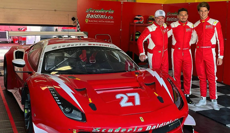 画像は、17年ぶりに元F1ドライバーのジャンカルロ・フィジケラと組み、フェラーリのGTカーをドライブするルーベンス・バリチェロ(帽子の人)クーデリア・バルディーニのフェラーリ488 GT3 Evoに乗り込み耐久レースに出場する。