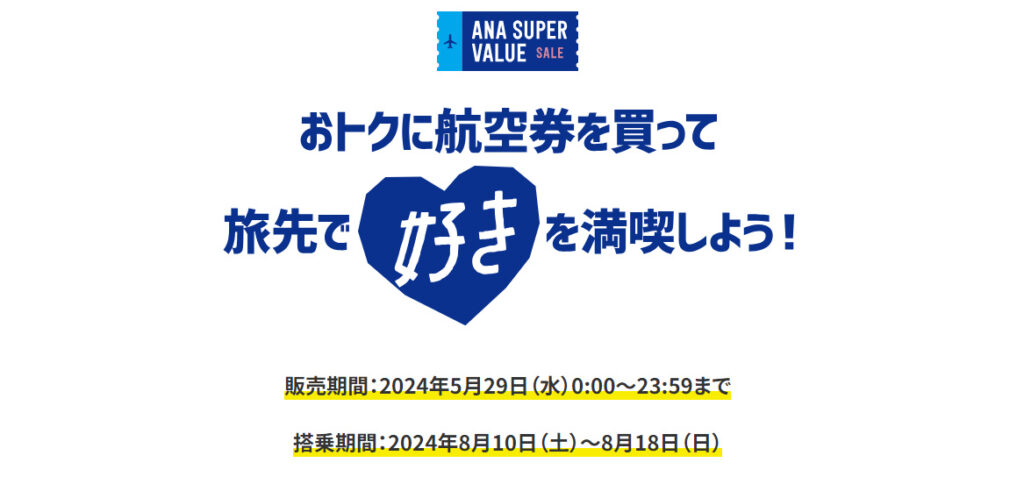 明日、正確には本日の深夜0:00~全日空(29)にかけて、ANA全日空のANAスーパーバリューセールが開催されます!今回は8月のお盆の搭乗期間:2024年8月10日(土)~8月18日(日)分の航空券のお得な航空券のタイムセールです!お見逃しなく!