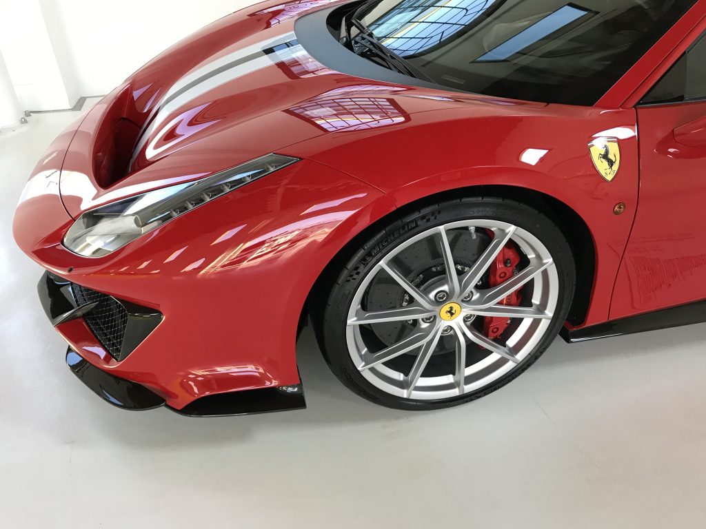 この488ピスタはシルバーベースのホイールに、赤のキャリパー仕様ですね。
