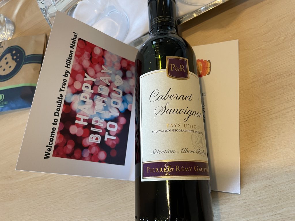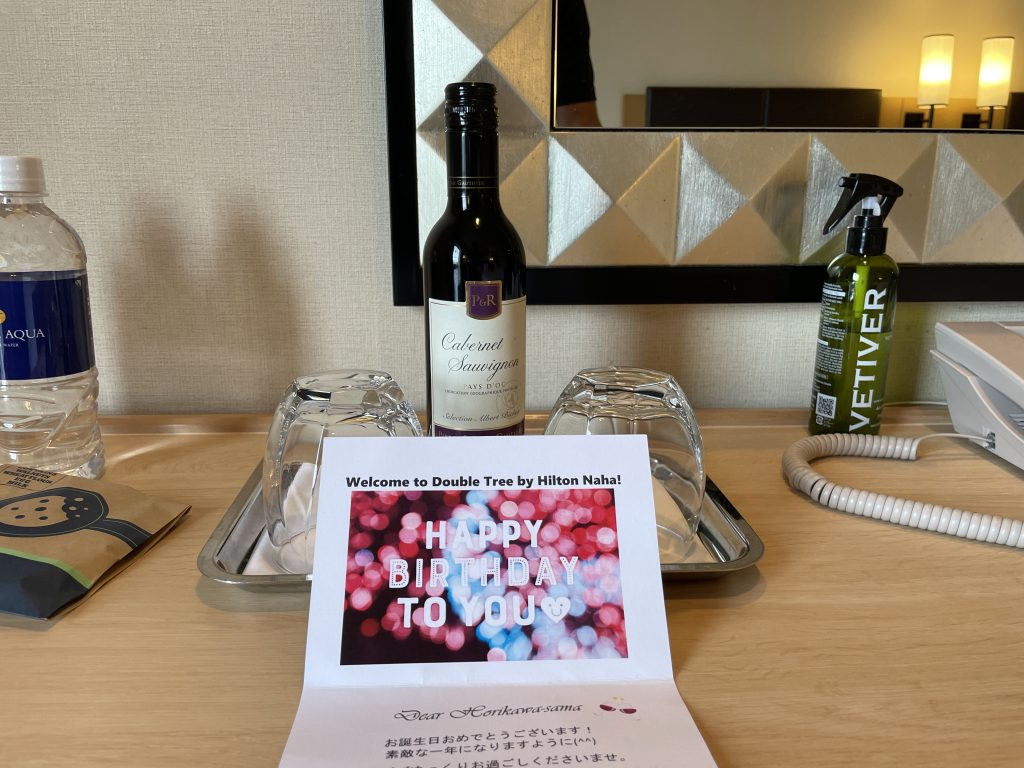 ヒルトン・プレミアムクラブ・ジャパンの特典のバースデーケーキを予約したからだとは思いますが、バースデーカードと赤ワイン(500ml)をプレゼントして頂きました!