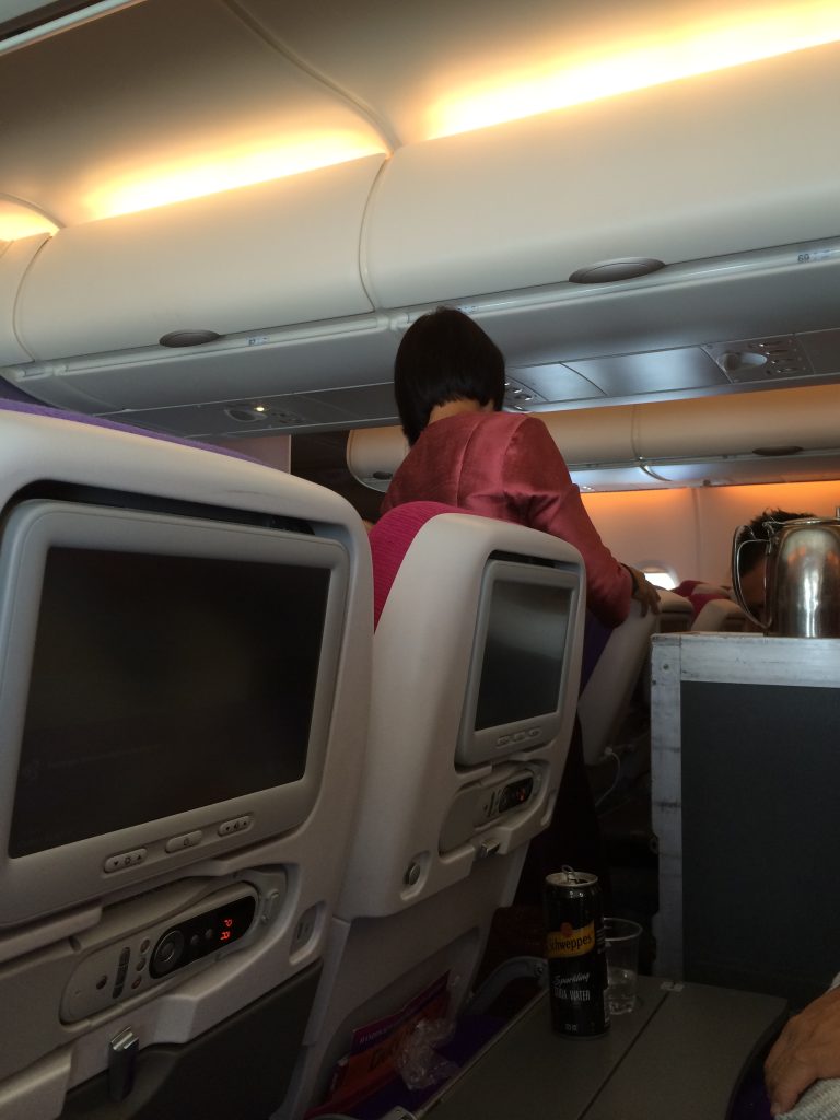 準備が始まったので、そわそわしました。国際線の場合、アルコールが提供されますが、アナウンスで強く「酩酊状態」という言葉を耳にします!タイ国際航空でしか聞かないフレーズです!
