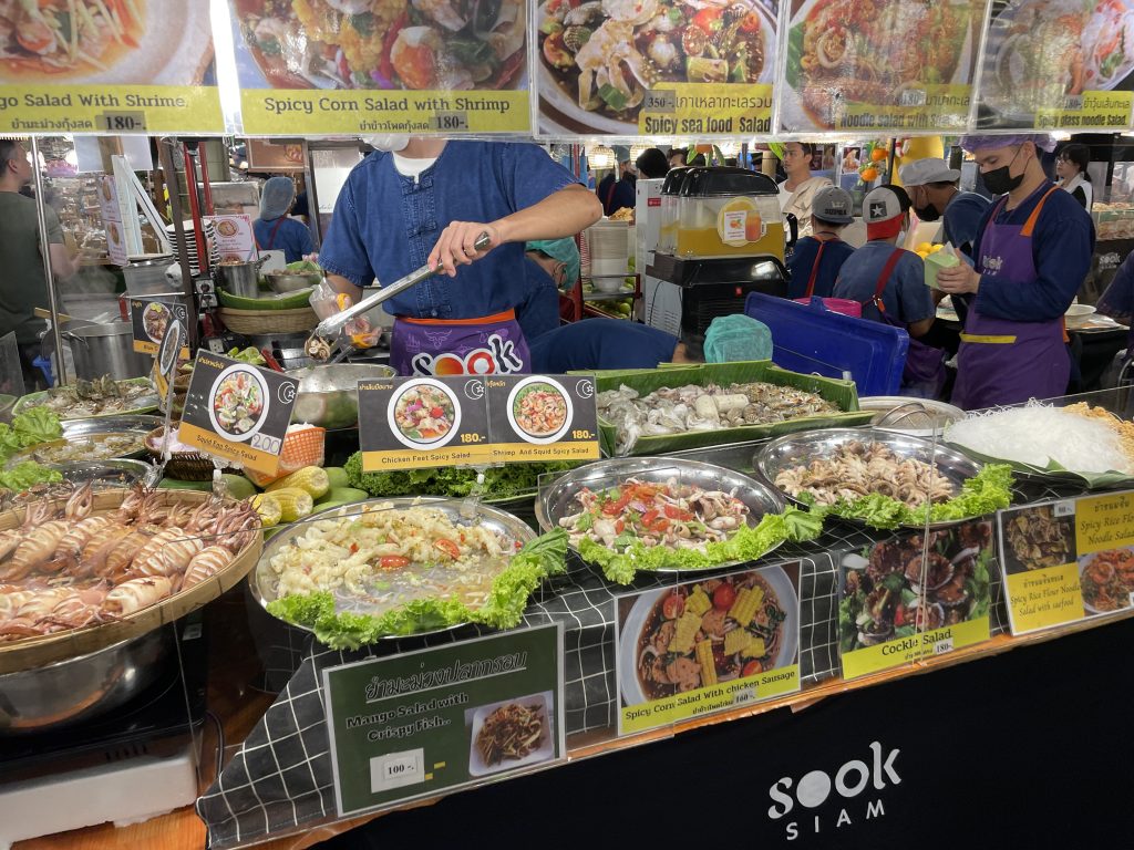 また、1階には「SOOKSIAM」(スックサイアム)という水上マーケットを模したタイの各地方の物産展のような広大なエリアがあり、お土産物を買ったり、屋台風のお店で地元の食べ物やスイーツを購入しその場で食べることも可能。エアコンが効いた快適な環境で、タイのローカルな雰囲気が楽しめる穴場のグルメスポットでもあります。