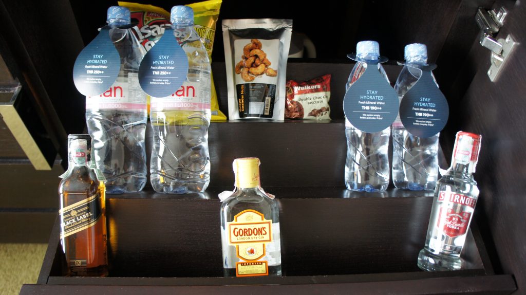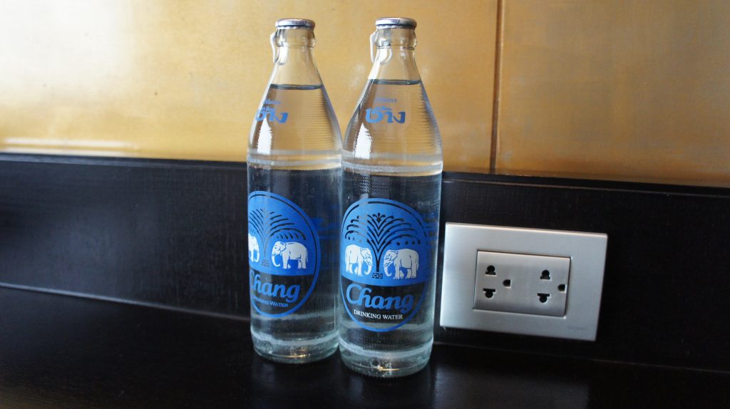 無料のお水は、ガラスボトル入りでした!しかもビールで有名な「Chang」製でした!