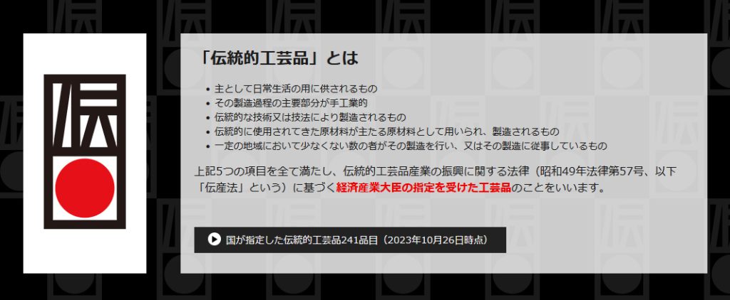 上記5つの項目を全て満たし、伝統的工芸品産業の振興に関する法律(昭和49年法律第57号、以下「伝産法」という)に基づく経済産業大臣の指定を受けた工芸品のことをいいます。