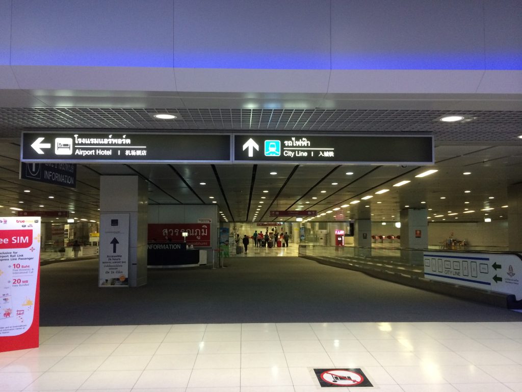 ノボテル バンコク スワンナプームエアポートホテルからスワンナプーム国際空港へ行き、直結のホ電車で市内へで向かいます。