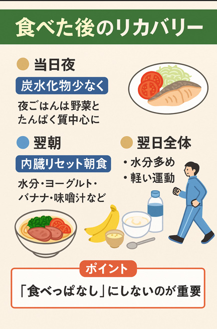 | 翌日全体 | 水分多め・ウォーキングなど軽い運動 |