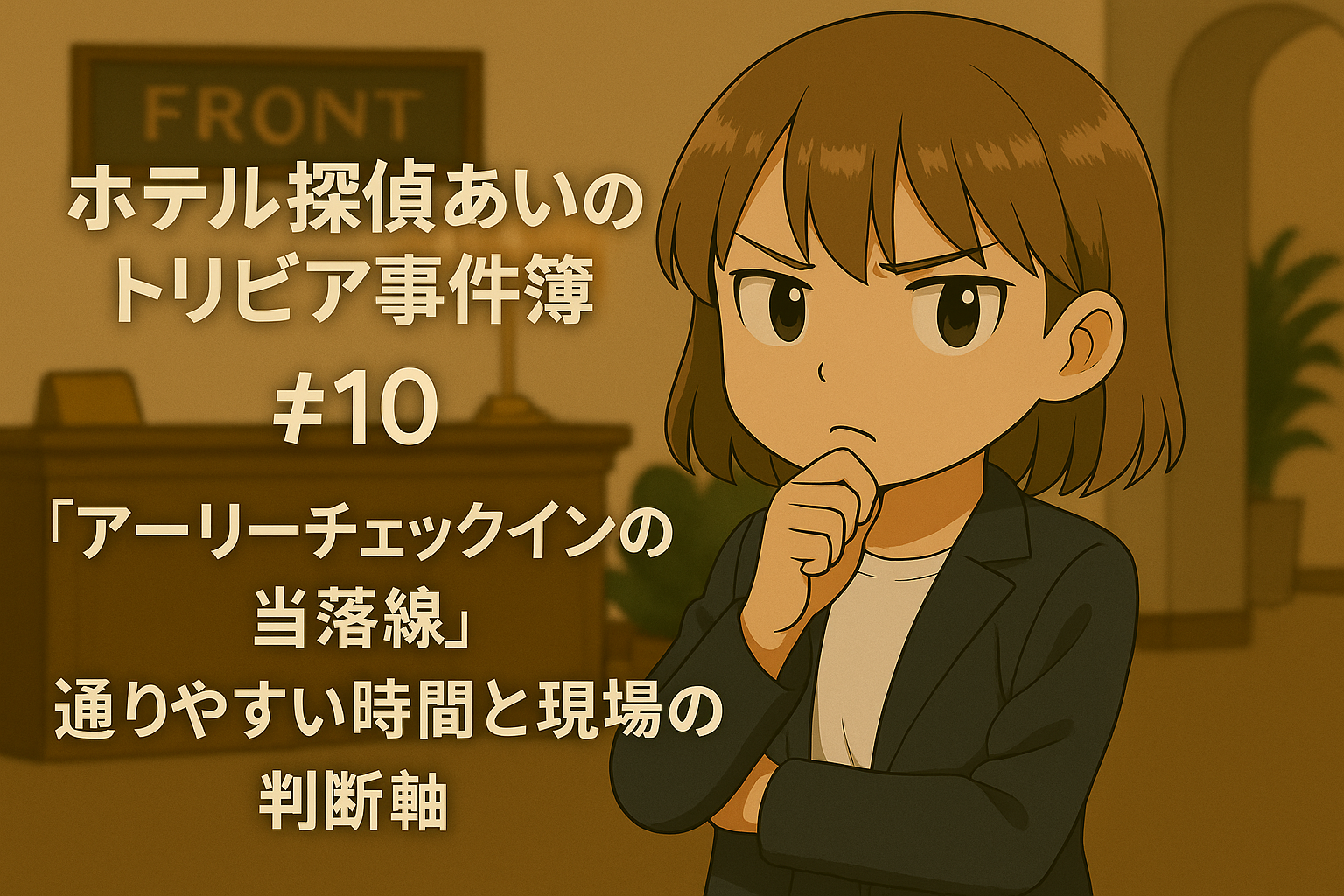 今回は「🕵️♀️ ホテル探偵あいのトリビア事件簿 #10 アーリーチェックインの当落線 ― 通りやすい時間と“現場の判断軸”」です。