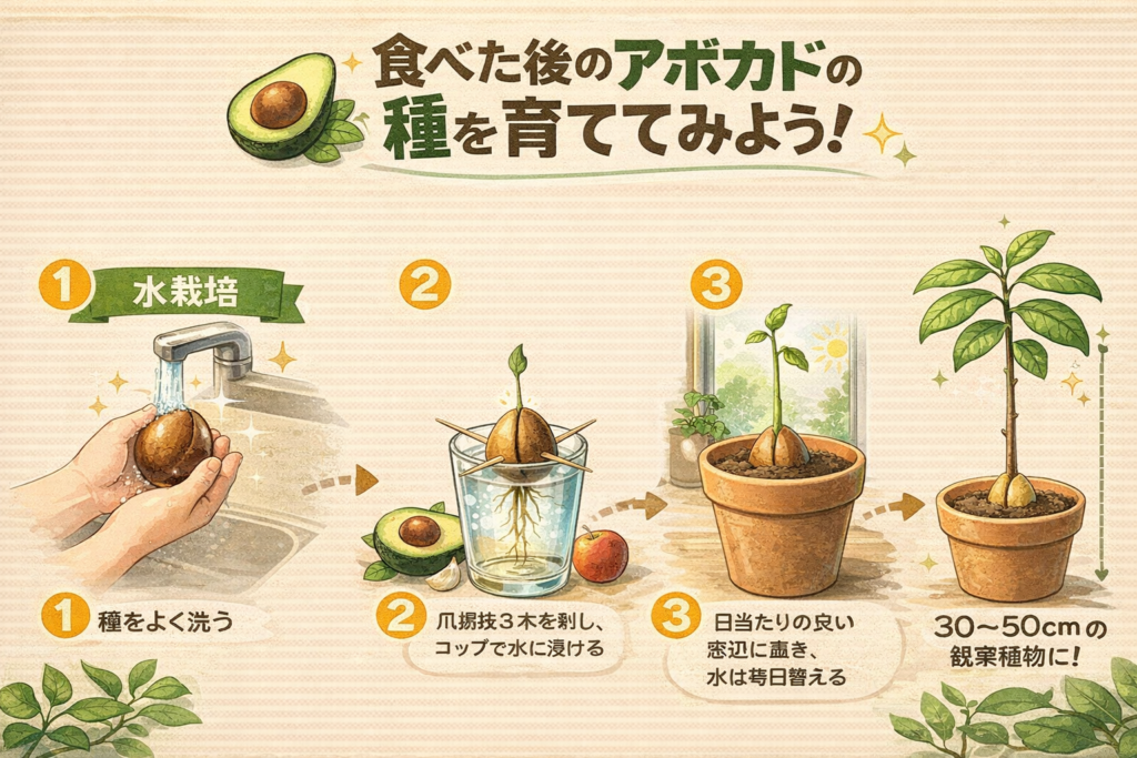 ✅ 6. 食べた後のアボカドの種を育ててみよう!