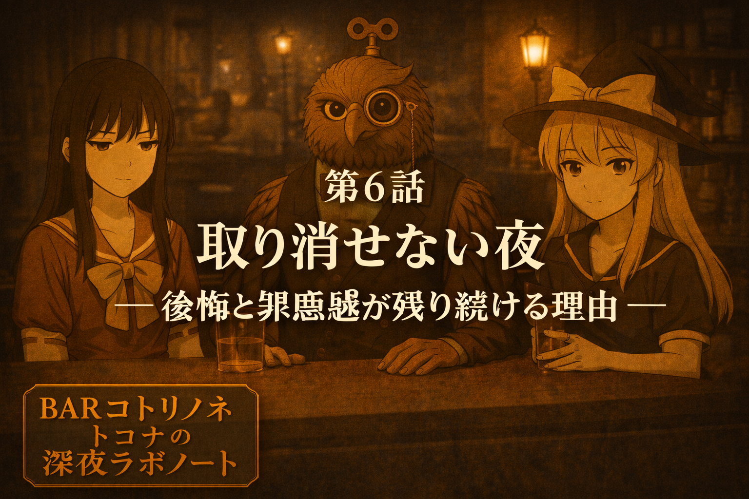 【第6話】取り消せない夜 ― 後悔と罪悪感が残り続ける理由|BARコトリノネ トコナの深夜ラボノート BAR コトリノネ X Facebook はてブ LINE コピー 2026.01.16 スポンサーリンク トコナ 「後悔は、心が“もう同じ選択をしない”と決めた証拠。」 【第4話】静かすぎる夜 ― 沈黙が怖くなる理由|BARコトリノネ トコナの深夜ラボノート BARコトリノネ トコナの深夜ラボノート 第1話|氷が溶ける夜のメッセージ PR スポンサーリンク 関連記事: BARコトリノネ トコナの深夜ラボノート【第3話】灯りを消せない夜 ― 心が静まらない理由 BARコトリノネ トコナの深夜ラボノート【第2話】雨粒が窓を叩く夜 ― 雨は心のメトロノーム BAR コトリノネ ― 心の謎をほどく探偵たち 第22話|ベルモット ― 黒い帽子の紳士 BAR コトリノネ ― 心の謎をほどく探偵たち 第24話|カルバドス ― 林檎の香りの面影