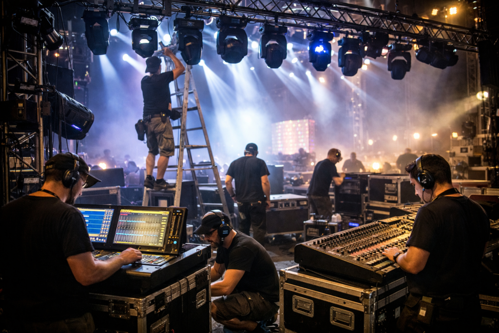 照明・音響・ステージ演出・モニター映像などを支えるのは、専門スタッフたち。