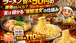 原価シリーズ ラーメン替え玉150円の原価はいくら?実は儲かる“追加注文”の仕組み【原価シリーズ】 ラーメン替え玉150円の原価はいくらなのか?麺の原価、スープとの関係、なぜ店にとって利益が出やすいのかを詳しく解説。ラーメン店の追加注文ビジネスの仕組みを数字でわかりやすく紹介します。 2026.04.01 原価シリーズ