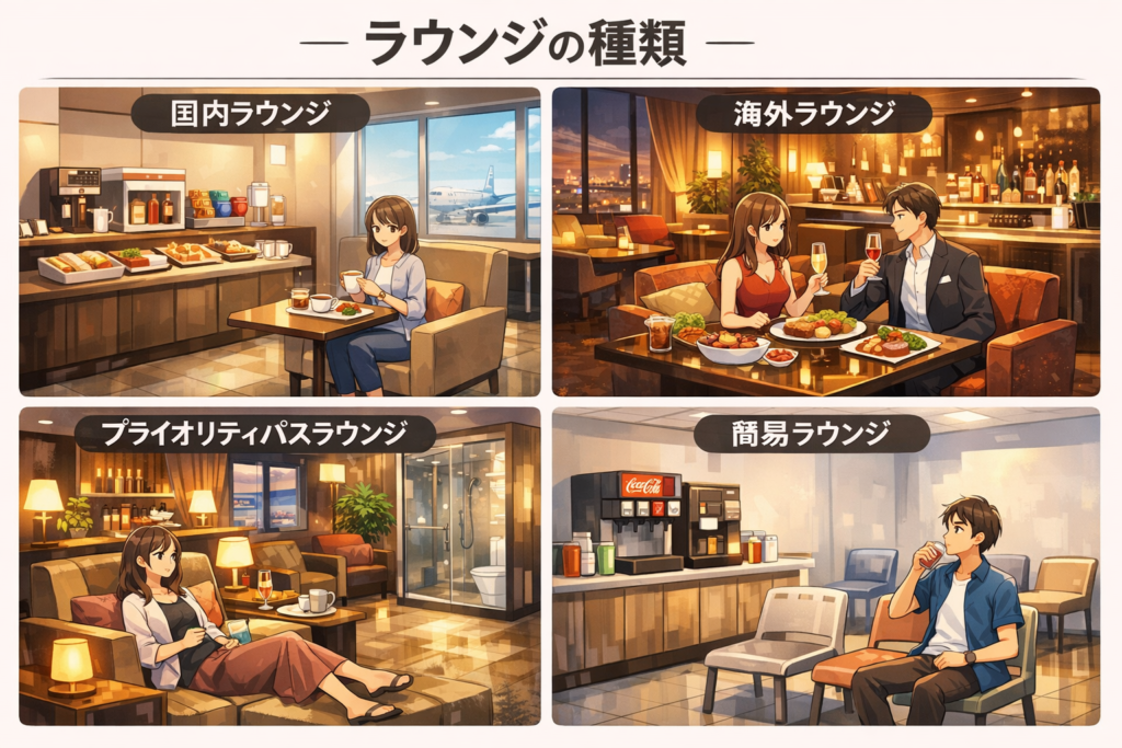 大きく違います。国内ラウンジは軽食やドリンク中心ですが、海外ラウンジ(特にプライオリティパス)は食事・アルコール・シャワーなど設備が充実しています。無料カードで利用できるのはほぼ国内ラウンジのみです。
