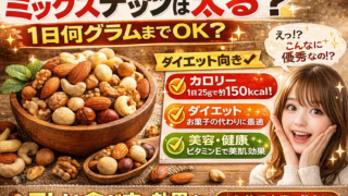ダイエット・ヘルスケア ミックスナッツは太る?1日何グラムまでOK?カロリー・効果・正しい食べ方を徹底解説 ミックスナッツのカロリーや1日の適量、太らない食べ方を詳しく解説。美容・健康効果や注意点もわかりやすく紹介します。 2026.04.07 ダイエット・ヘルスケア